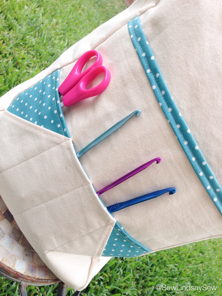The bag has neat pockets on the front to hold any sort of craft supplies, but they work especially well for knitting needles – and can accommodate those funny-looking round needles, too. (I don’t have any knitting supplies so I had to use my crochet hooks for the photo, which doesn’t look nearly as whimsical as the photo on the pattern with all of the lovely knitting needles, but you know, life goes on).