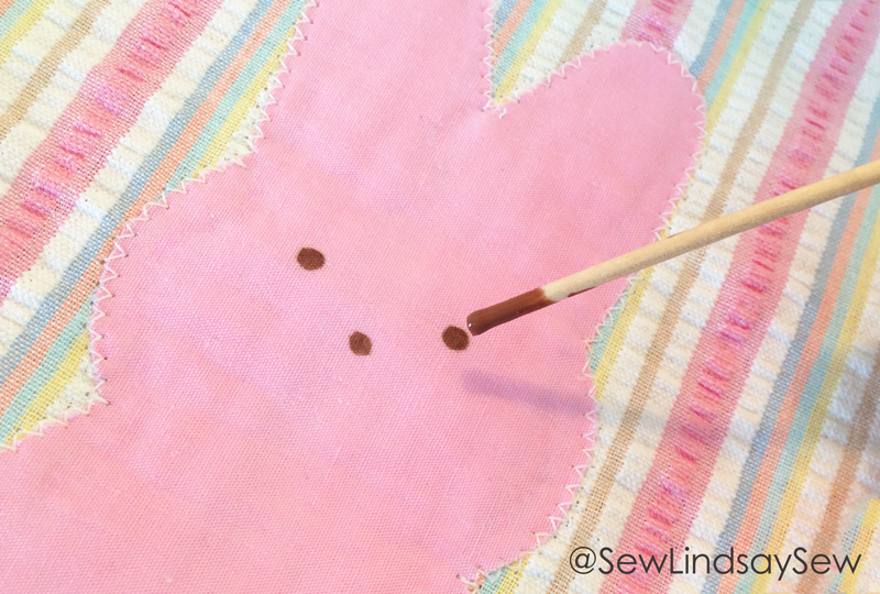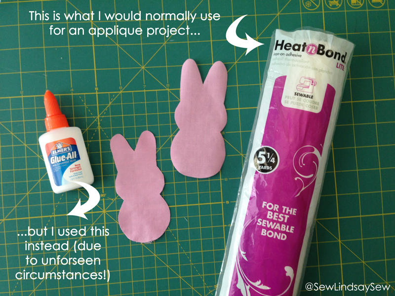 For any other appliqué project, I would have slapped some Heat n Bond on the backside of the bunnies, but the solid pink fabric was too sheer – when I laid the bunnies on top of the striped fabric, I could see the stripes through the bunny. No likey. So for this project, I first used some fusible interfacing on the back of the bunnies, and then used a little Elmer’s glue to stick them in place before zig zag stitching the edges. I gave them a quick press with a hot iron after gluing to make sure the glue set before I sewed. Not the most ideal process, but it worked.