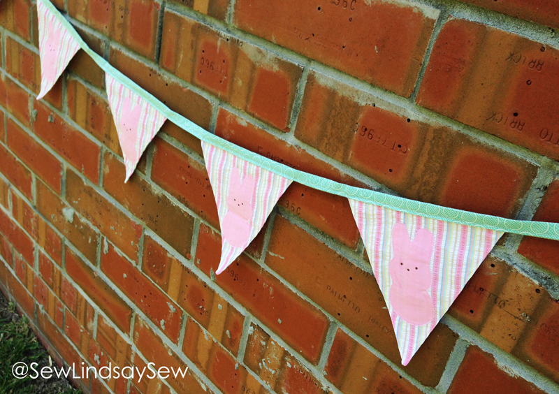 For my resourceful workaround, I decided to turn the Peeps bunnies into an appliqué for a triangular pennant bunting instead. After playing around with the fabric choices I already had in my bin, I decided that – for the first time ever – the pastel stripes were perfect! Do they scream “EASTER” or what?